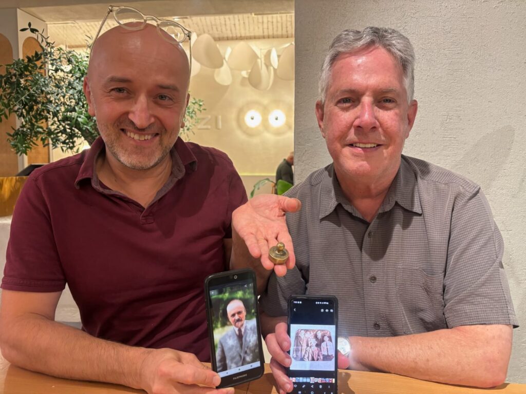 As we sat together, Dan and Janice, me and my wife Zofia, sharing stories of our modern families, we reached a moment of pure synchronicity. We both pulled out our phones to show photos of our respective great-grandfathers. Seeing Szaja and Abraham side-by-side on our screens, Janice had a beautiful idea: “Let’s take a photo of you holding their photos.” In that moment, I also held the brass weight—created by their father, Izaak—over the images. It felt as though the brothers were finally reunited through their descendants.