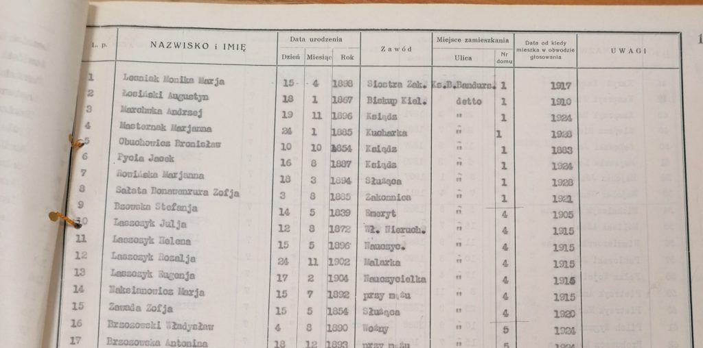 Names with page and file number are found on a master Voting List housed in the Kielce Archive. The details for each voter include: