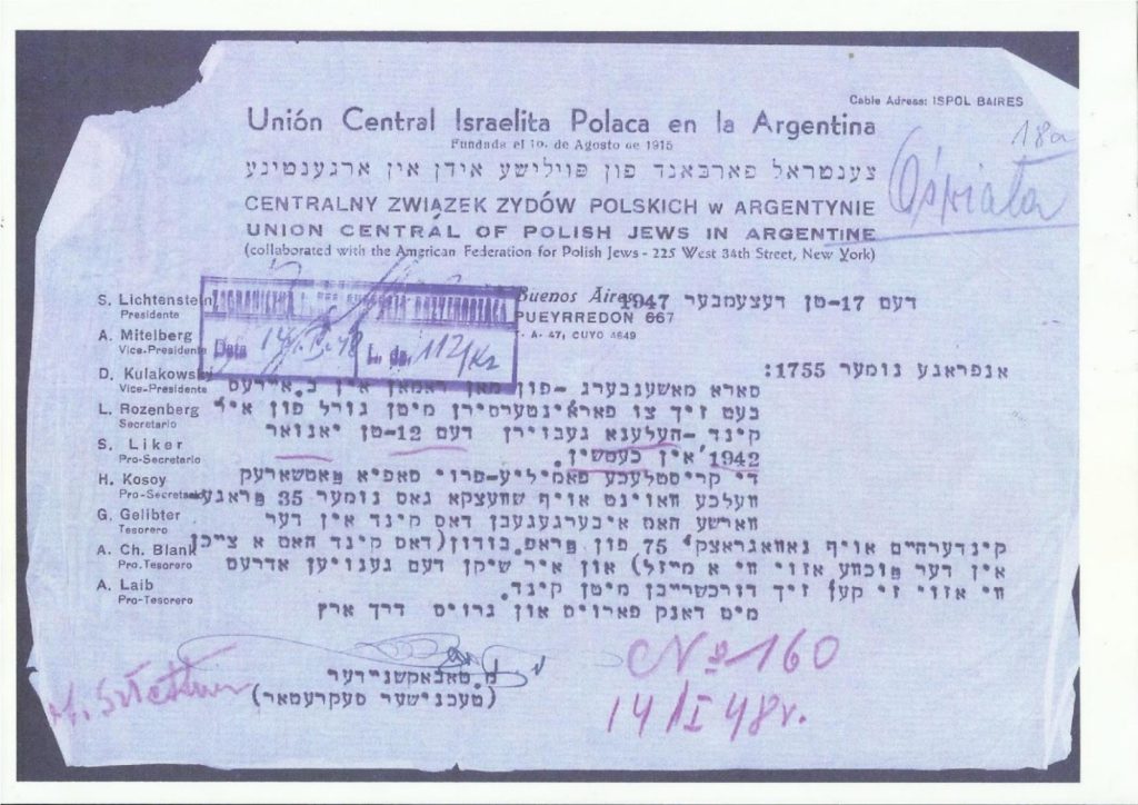 17.12.1947 Case no. 1755: Sara Moszenberg, married to Roman, in Buenos Aires, asks about the fate of her child Helena, born 12 January 1942 in Chęciny. The Christian woman, Mrs Zofia Paciorek, who lives at 35 Szwedzka Street, Praga, Warszawa, handed the child to the Baudouin Children’s Home at 75 Nowogrodzka Street. (The child has a birthmark on her groin, resembling a mouse). She requests that the exact address be sent to her so she can write to the child. With thanks and respect, M. Tabaksznajder, Technical Secretary.
